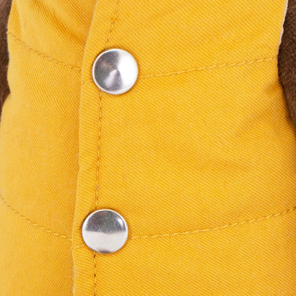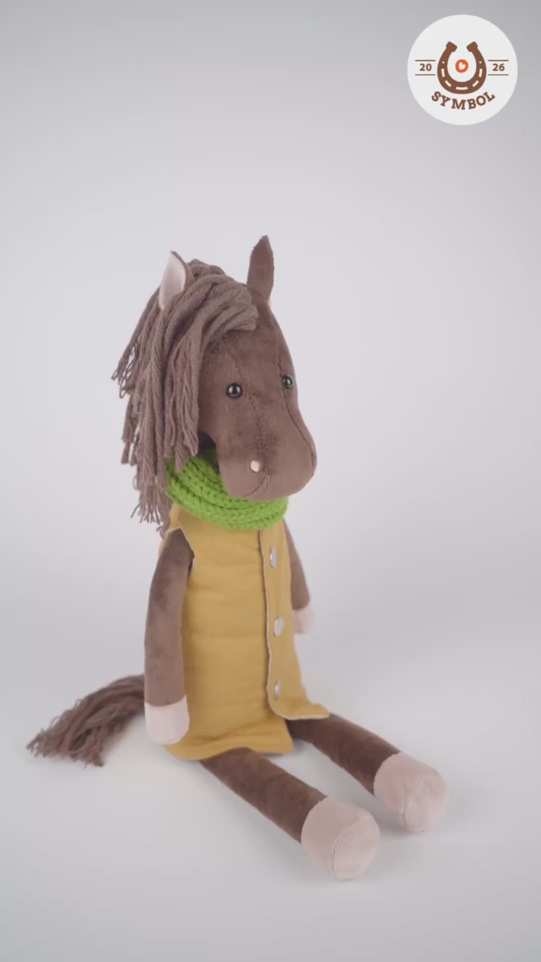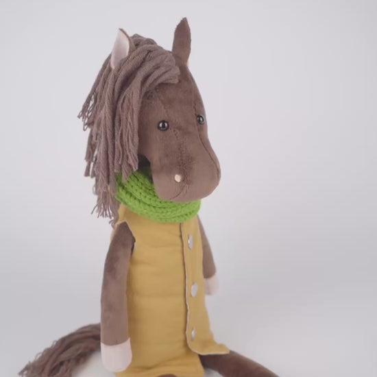 🐎 Bruno este un căluț de pluș premium, cu o ținută modernă – geacă galbenă cu nasturi metalici și fular verde tricotat, ce aduce o notă veselă și stilată în orice decor.