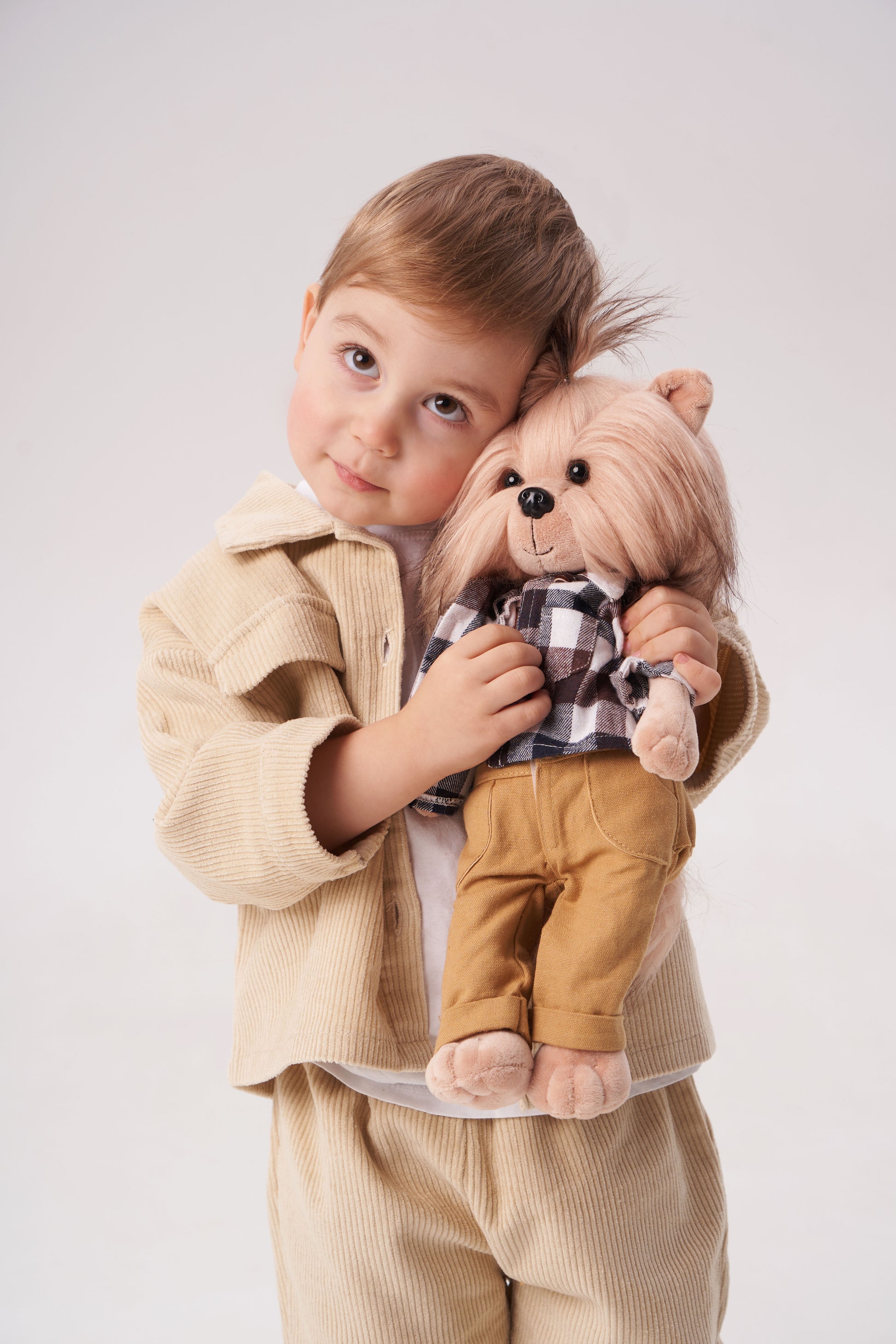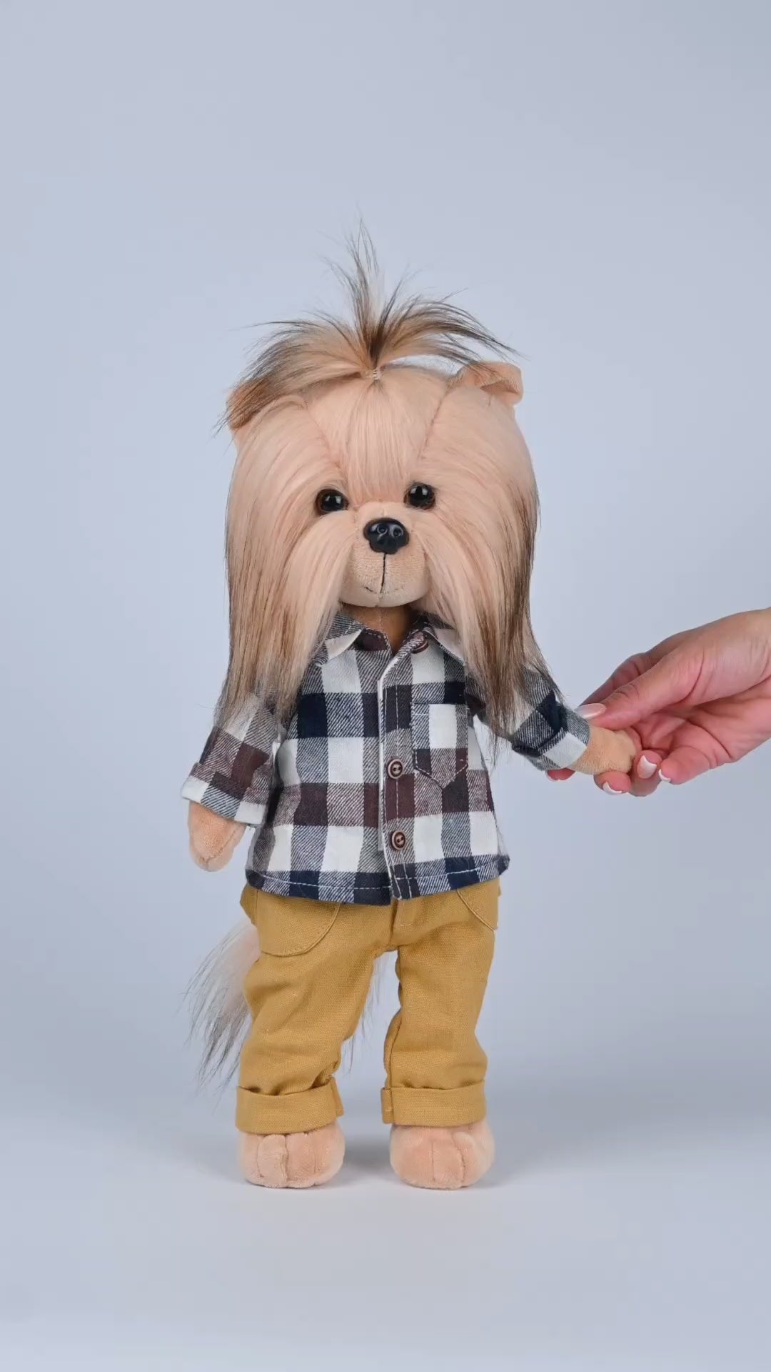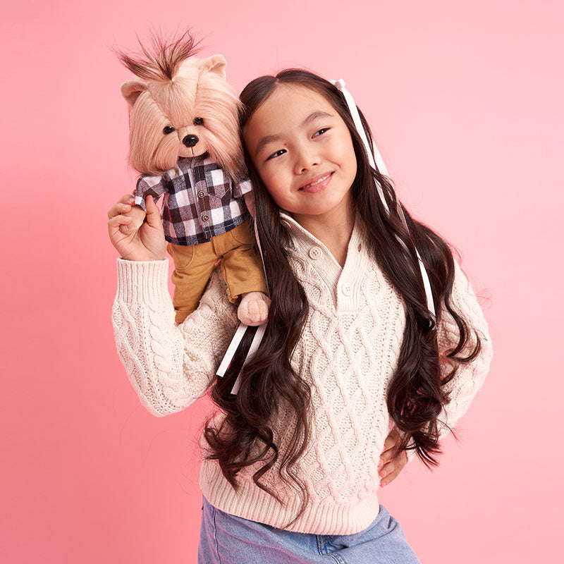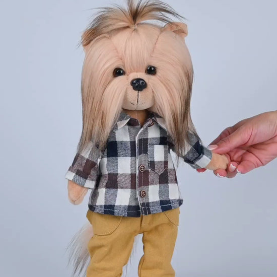 Întâmpină-l pe Lucky Andy, cel mai cool cățeluș din colecția Lucky Doggy! Cu un look casual și expresiv, Andy îmbină rafinamentul cu distracția într-o manieră unică. Îmbrăcat într-o cămașă în carouri în nuanțe naturale și blugi comozi, stilul său urban este completat de un păr bogat, prins într-un moț jucăuș.