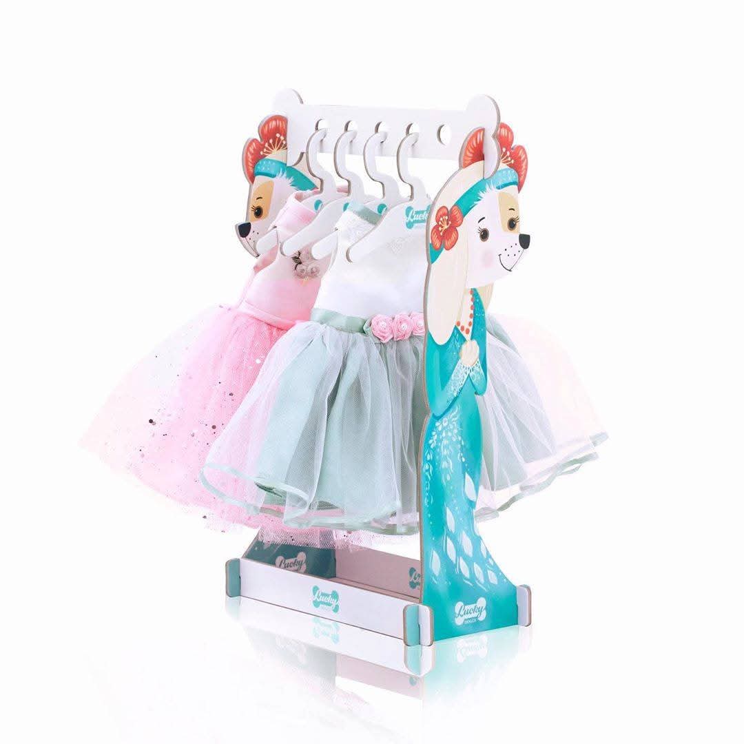 Cățelușa vine într-o cutie cadou, unde veți descoperi o surpriză: un dulap cu umerașe pentru viitoarele ținute ale lui Yoyo și o cărticică de colorat cu stickere. Lucky Yoyo nu este orice fel de jucărie! Cu articulații speciale aflate în interiorul jucăriei, ea poate sta în diferite poziții, oferind senzația că este o cățelușă reală.