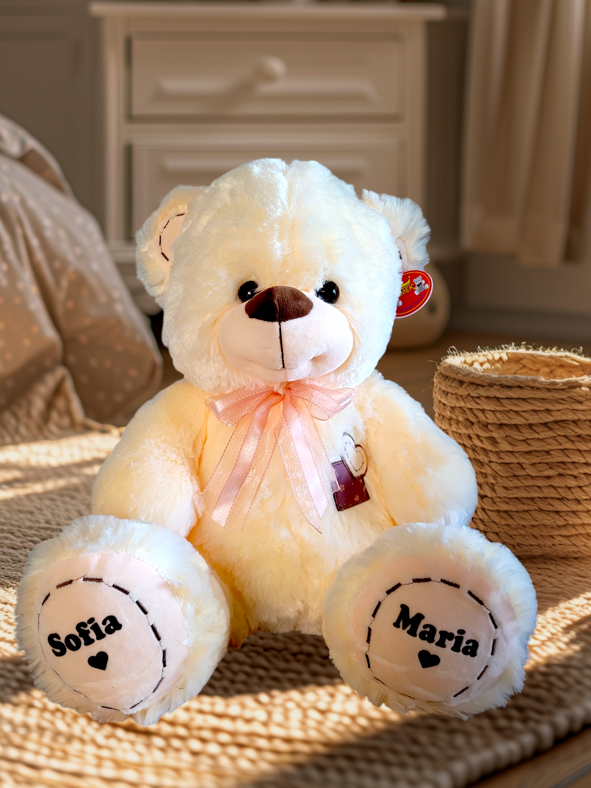 Ursuleț de pluș cu inimă brodată,personalizat pe tălpițe, cadou adorabil pentru toate vârstele, 40 cm