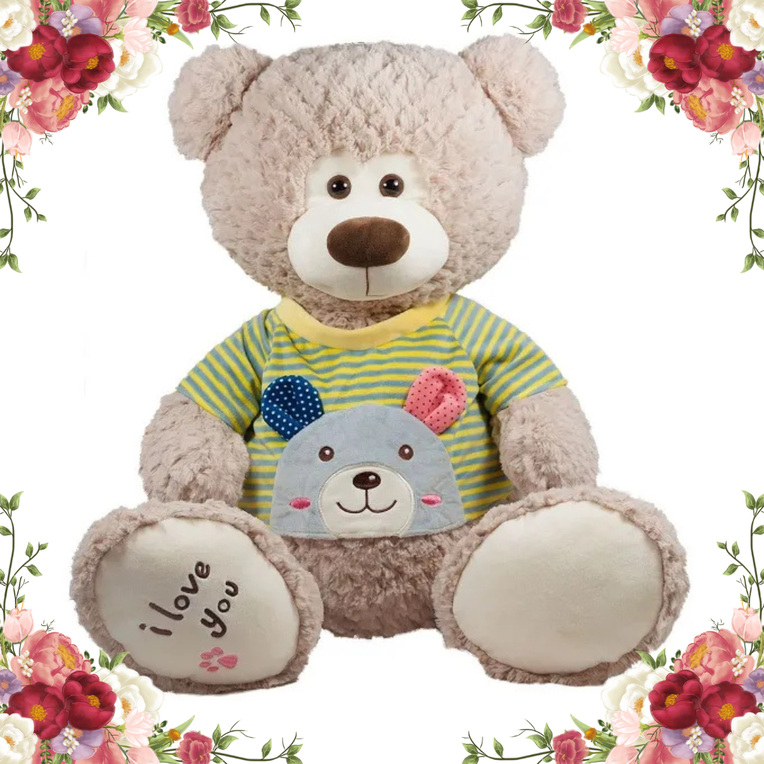 Oferă un cadou cu suflet – un ursuleț de pluș de 42 cm, moale și prietenos, ideal pentru cei mici, dar și pentru adulții care iubesc lucrurile pline de emoție. Cu o inimioara delicata, acest ursuleț poate fi personalizat cu nume sau mesaj pe tălpiță, devenind astfel un dar cu adevărat unic.