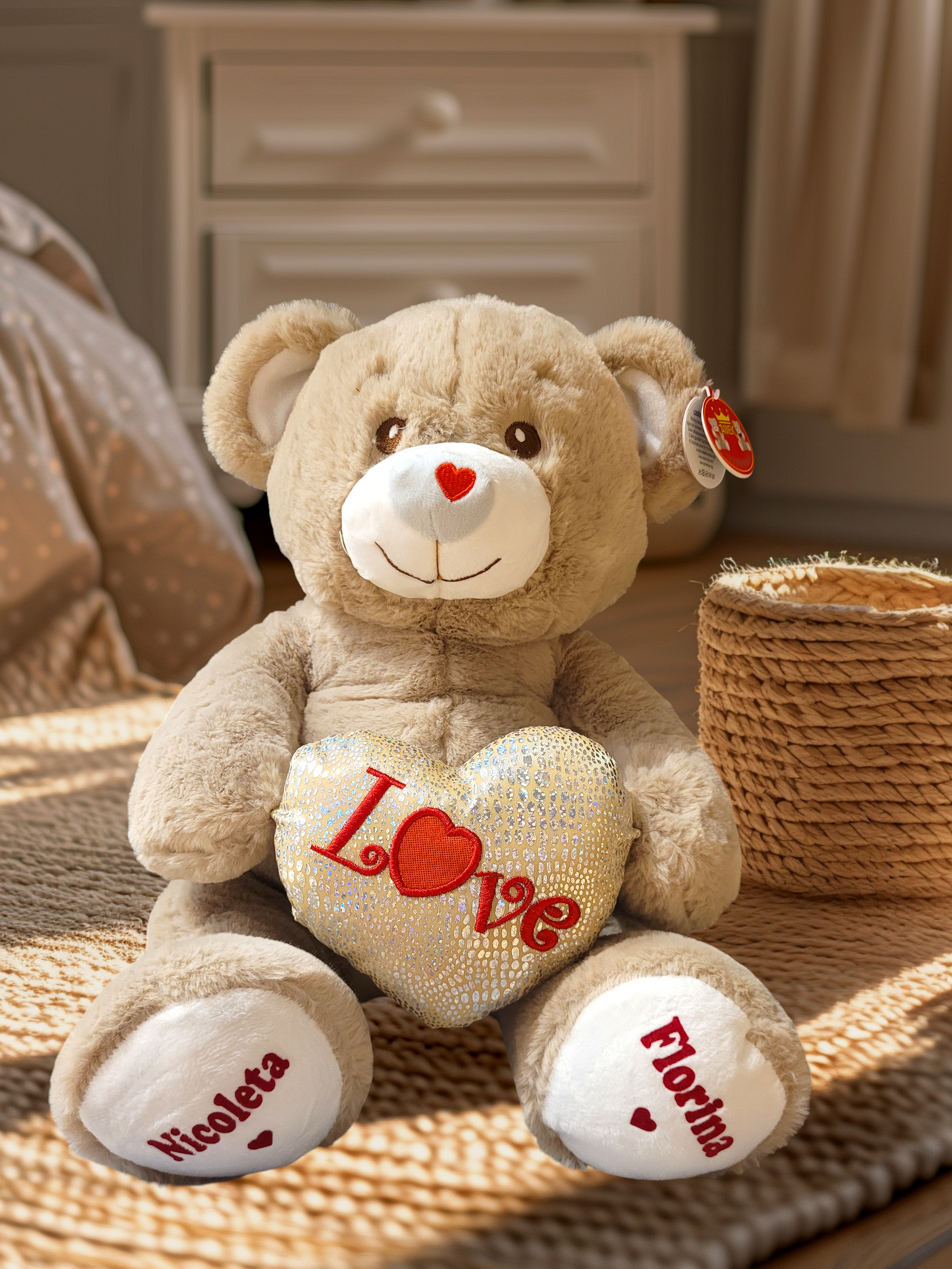 Oferă un cadou cu suflet – un ursuleț de pluș de 40 cm, moale și prietenos, ideal pentru cei mici, dar și pentru adulții care iubesc lucrurile pline de emoție. Cu o inimioara delicata, acest ursuleț poate fi personalizat cu nume sau mesaj pe tălpiță, devenind astfel un dar cu adevărat unic.